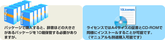 会社などで、まとまった数のソフトウェアを一括購入するなら、ライセンス(マスターCD-ROMと必要な数の「使用許諾」(ライセンス証書)を取得すること)がお得です。